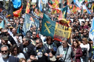 Miles de policías y guardias civiles se han manifestado hoy por las calles de Madrid convocados por la asociación Jusapol para pedir una equiparación salarial, que, según los convocantes, no se ha conseguido con el acuerdo de sindicatos y asociaciones con el Ministerio del Interior.