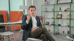 Rivera recibe a Vozpópuli en su despacho de la sede de Ciudadanos en Madrid. Es un espacio amplio, diáfano y con poca decoración. El cuadro 'El abrazo' de Juan Genovés está en una de las estanterías. Cerca de su mesa de trabajo tiene una reproducción del cartel electoral con el que John Kennedy se presentó como candidato a senador de los Estados Unidos. Hay una camiseta de la selección española dedicada por el futbolista Nolito.