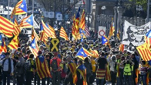 "Autodeterminación no es delito" y "Democracia es decidir" son los lemas de esta marcha que ha partido de Atocha y que concluirá en la plaza de Cibeles, y a la que han llegado miles de personas procedentes de Cataluña en cerca de 500 autocares y una quincena de trenes AVE.