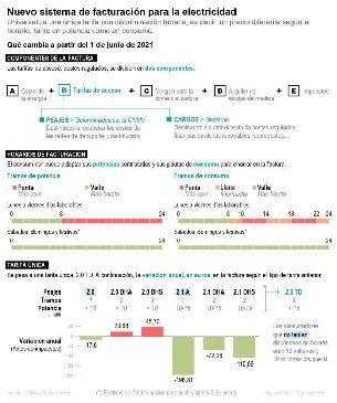 Para los primeros, el componente regulado de la factura se va a reducir un 6,7 %, mientras que para los segundos aumentará levemente, en unos 2 euros al mes, según fuentes de la CNMC. Eso en principio y si el consumidor no hace nada, porque las nuevas tarifas introducen diferencias en los precios en tres periodos horarios y se podrán contratar dos potencias distintas, lo que bien utilizado por el consumidor le puede reportar ahorros muy significativos.