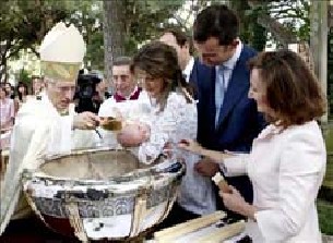 Tranquila, bien despierta y sin llorar, atenta a todo en los brazos de su madre, la Princesa de Asturias, fue bautizada este domingo en el Palacio de la Zarzuela la Infanta Sofía de Todos los Santos. El cardenal arzobispo de Madrid, Antonio María Rouco Varela, administró el sacramento a la segunda hija de Don Felipe y Doña Letizia y octava nieta de los Reyes, en una ceremonia privada que se celebró en los jardines de la residencia real. En el momento en que el oficiante derramó sobre la cabeza de la niña, que lleva el nombre de su abuela paterna, la Reina, el agua del río Jordán en la histórica pila de Santo Domingo de Guzmán, los nietos mayores de Don Juan Carlos y Doña Sofía abandonaron su lugar para acercase y poder ver más de cerca la ceremonia. Mientras, la primogénita de Don Felipe y Doña Letizia, la Infanta Leonor, iba de un lado a otro del jardín fijándose en todo. El altar donde se encontraba monseñor Rouco Varela y los oficiantes fue uno de los lugares predilectos de Leonor, que tuvo que ser rescatada en más de una ocasión tanto por su padre, el Príncipe, como por su abuelas, la Reina y Paloma Rocasolano, y su cuidadora. . El único nieto de los Reyes que permaneció en casi todo momento en su lugar fue el hijo mayor de la Infanta Cristina, Juan. Felipe Juan Froilán Marichalar y Borbón, muy consciente de ser el nieto mayor de Don Juan Carlos y Doña Sofía, permaneció serio y atento durante el bautizo de su prima más pequeña. La Infanta Elena, que estuvo junto a la Princesa de Asturias y acompañada por su hija Victoria Federica, tuvo detalles muy cariñosos tanto con Doña Letizia, como con su sobrina. La ceremonia comenzó pasadas las 19.45 horas y terminó casi una hora después cuando el coro de las religiosas Hijas de Santa María de Jesús, de la localidad madrileña de Galapagar, entonaron una nana expresamente compuesta para la niña, acompañándose de guitarras y castañuelas. Doña Letizia, que tuvo durante todo el acto a su hija en brazos, la estrechó con ternura y le acarició al tiempo que tuvo que atender a su hija mayor que, un par de veces, intentó ocupar el lugar de su hermana. Una imagen de Cristo Crucificado y la de la Virgen de la Ermita presidieron el bautismo, en el que el arzobispo castrense, Francisco Pérez, y otros cuatro concelebrantes asistieron a Rouco Varela, quien, como despedida, se refirió a las palabras de Cristo cuando dijo: dejad que los niños se acerquen a mi, en alusión al protagonismo que esta tarde tuvieron los nietos más pequeños de los Reyes. En el momento del bautismo, la Princesa de Asturias, sostuvo a la niña, acompañada del Príncipe y de los padrinos, la abuela materna Paloma Rocasolano, y el príncipe de Vidin, Konstantín de Bulgaria, hijo del rey Simeón, que fue primer ministro de ese país. Los Reyes siguieron el oficio religioso desde la primera fila de sillas colocadas en el lado del Evangelio, junto a los Príncipes de Asturias y sus dos hijas, y los Duques de Lugo y de Palma. En el lado de la Epístola estaba la familia de la Princesa de Asturias. Sus padres, Jesús y Paloma; sus abuelos, Menchu, Enriqueta y Francisco -bisabuelos de Sofía- y su hermana Telma, además de otros invitados, como la única sobrina de Doña Letizia, Carla. La vicepresidenta del Gobierno, María Teresa Fernández de la Vega representó al Ejecutivo, junto al ministro de Justicia, Mariano Fernández Bermejo, que siguieron el acto también desde el lado de la Epístola, mientras que la familia del Rey y la Reina ocuparon el lado contrario. Entre los representantes de las altas instituciones del Estado que asistieron al bautizo real estaban también los presidentes Congreso, Manuel Marín; del Senado, Javier Rojo; del Tribunal Constitucional, María Emilia Casas, y del Tribunal Supremo y del Consejo General del Poder Judicial, Francisco Hernando, así como el alcalde de Madrid, Alberto Ruiz Gallardón. Al igual que en el bautismo de su hija mayor, entre los invitados estaba el equipo médico que atendió a Doña Letizia en el alumbramiento de la Infanta Sofía, el pasado 29 de abril en una clínica madrileña, con el ginecólogo Luis Ignacio Recasens al frente. El resto de los invitados, como los altos cargos de la Casa del Rey, el decano de la Diputación Permanente y Consejo de la Grandeza, el Conde de Elda, y amigos de los Príncipes estuvieron también en la ceremonia. Como ya sucedió el 14 de enero de 2006 cuando recibió el bautismo la primogénita de Don Felipe y Doña Letizia, se cumplió con las tradiciones de la Familia Real española de utilizar la pila reservada para los príncipes e infantes de España desde el siglo XIX y en la que fueron bautizados los tres hijos de los Reyes; de acristianar a la niña con agua del río Jordán y de vestirla con el faldón familiar. Faldón que utilizó su abuelo, el Rey, hace 69 años, y después sus hijos, el Príncipe y las Infantas, y sus descendientes. Rouco vertió el agua traída desde Tierra Santa con la concha de plata sobredorada de la capilla del Palacio Real que se utiliza siempre en los bautizos de la Familia Real. Una vez terminada la misa, los Príncipes, ella con Sofía en brazos y él con Leonor, se acercaron hasta la imagen de la Virgen de la Ermita del Palacio de la Zarzuela para ofrecerle a la niña. Tanto al inicio como al término del oficio religioso, los Príncipes y los Reyes saludaron a los oficiantes y a las religiosas del coro antes de pasar a disfrutar de un vino al que seguirá una cena con los familiares más allegados. Antes del bautizo, la Familia Real y la de la Princesa de Asturias posaron en el salón de audiencias del Palacio para el álbum familiar. Doña Letizia llamó la atención de los periodistas sobre los ojos de la Infanta Sofía en su segunda aparición pública tras la salida de la clínica el pasado 4 de mayo. La Princesa comentó que la niña pesaba más que su hermana y que reclama más atención, mientras que Don