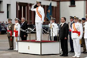 El Príncipe de Asturias acudió este lunes a la Escuela Naval de Marín, donde presidió la jura de bandera de 64 alumnos y la entrega de reales despachos a 96 oficiales de la Armada. Como es habitual, el acto se celebró coincidiendo con la festividad de la Virgen del Carmen (patrona de la Armada Española), y con la ovación de los familiares y amigos de los alumnos. Felipe de Borbón hizo acto de presencia a las 11.40 horas (estaba previsto el comienzo de la ceremonia a diez minutos antes), fue recibido por los responsables de la escuela y autoridades políticas gallegas (acudió, entre otros, el presidente de la Xunta, Emilio Pérez Touriño) y procedió a pasar revista al batallón de alumnos. Comenzaron, entonces, los honores de ordenanza, a golpe de "Viva España" desde el buque escuela "Juan Sebastián de Elcano" y de la fragata "Almirante Juan de Borbón". También sonaron, desde estos puntos, las armas. Como se suele hacer en grandes ocasiones, se escucharon hasta 21 tiros. A partir de ahí, sonó el himno español con la incorporación de la bandera al lugar por el que luego pasarían los alumnos, y salió el sol, tras un comienzo de la mañana lluvioso. La misa comenzó con calor y con el príncipe colocado a la derecha del arzobispo castrense, Francisco Pérez González, y otras autoridades como el ministro de Defensa, José Antonio Alonso, o el Almirante Jefe del Estado Mayor de la Armada, Sebastián Zaragoza Soto. No faltó, en esta jornada, la Salve Marinera, posterior a la misa, que dio paso al homenaje a los caídos, a los que "murieron con honor" por la patria, colocando una corona. Tras recordar a los que perdieron la vida, los 64 alumnos se prepararon para efectuar el juramento a la bandera, entre ellos una mujer y un hombre tailandés. Uno a uno, fueron desfilando y besando a la bandera, bajo la que pasaron, posteriormente, de tres en tres, manifestando así su compromiso a defender a la patria "aún a costa de la vida". A su paso, gritos emocionados de familiares y amigos, que esperaban el momento desde las gradas habilitadas para la ocasión. No acabó ahí la ceremonia, pues cuatro de los alumnos recibieron condecoraciones por ser el número uno de su promoción. Esto es, recibieron la Cruz del Mérito Naval con Distintivo Blanco, si bien al Alférez de Navío, Marcos Rafael de Sousas Fuchs, que obtuvo las más altas calificaciones en su cuerpo y escala, le fue entregado un premio por parte del presidente de la Xunta. Después comenzó la entrega de los reales despachos, que acreditaron como oficiales a 96 alumnos (entre ellos cuatro mujeres), que a partir de ahora partirán hacia otros destinos, más allá de la Escuela Naval de Marín. También estos, desfilaron bajo la bandera, para despedirse de la escuela. El comandante director de la Escuela Naval Militar de Marín, José Luis Urcelay Verdugo, pronunció el discurso de jura de bandera y entrega de despachos, agradeciendo a Felipe de Borbón su asistencia a "un acto como aquel del 16 de julio de 1987, hace hoy veinte años, en el que recibisteis vuestro despacho de oficial de la Armada de manos de Su Majestad el Rey". Fue también, aseguró, coincidiendo con la "festividad de nuestra patrona", que protege a los navegantes españoles "de las cinco marinas: la Armada, la Mercante, la de pesca, la deportiva y la científica". Después de dirigirse al Príncipe de Asturias y a las autoridades presentes, el comandante dedicó unas palabras a los aspirantes, asegurando que el "juramento o promesa que acabáis de hacer es un compromiso de servicio a la Patria que, aunque alcanza su expresión más sublime en el sacrificio de la propia vida, se demuestra de forma ordinaria en el cumplimiento fiel de nuestras obligaciones". Esto es así, añadió, porque "la obediencia y el cumplimiento del deber constituyen y fundamentan nuestro honor", de ahí que pida a los alumnos que tengan "siempre presente la lealtad". A los oficiales, les recordó que el de hoy es "un hito fundamental en vuestras carreras" y les animó a que "el hábito de estudio, la mentalidad abierta para afrontar el cambio y la inquietud intelectual" sigan dominando "vuestra carrera". Les sugirió, además, escuchar a los "subordinados" y conformar un "equipo eficaz al que todos se sientan orgullosos de pertenecer". Con esto, un "¡Viva España!, ¡Viva el Rey!", el Himno de la Armada (que también cantó el Príncipe) y un desfile final, concluyó la fiesta.