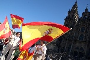 Una treintena de personas se concentraron en la compostelana plaza del Obradoiro para rendir un homenaje a la bandera de España, en un acto convocado por las Nuevas Generaciones del Partido Popular de Santiago con motivo del día de la fiesta nacional. Los defensores de la patria nacional no estuvieron solos en una plaza muy concurrida por turistas, peregrinos y transeúntes. Un grupo de jóvenes nacionalistas comenzaron a corear desde un extremo de las escaleras de la Catedral consignas como "A solución, autodeterminación", "Caña, caña, caña, contra España" o "Ao bote, ao bote, español o que non bote". Por su parte, los simpatizantes de la concentración convocada por Nuevas Generaciones respondieron al grito de "España una y no 51". Todo en un contexto de tranquilidad y ante la mirada curiosa de turistas y paseantes que atendían, divertidos, a los gritos de los dos pequeños grupos. Los militantes y simpatizantes congregados por Nuevas Generaciones corearon un sonoro "Viva España" al término de un discurso en el que se defendieron los pilares que, según consideran, sustentan al Estado: la bandera, el himno nacional, junto a la Constitución y la Monarquía. El responsable local del PPdeG, Gerardo Conde Roa, leyó un manifiesto en el que se puso de relevancia la defensa de la ?enseña nacional? por su especial representación de ?la nación? y de ?la soberanía, independencia, unidad e integridad de la patria?. En esta línea, valoró especialmente el papel de la bandera como símbolo de los ?valores superiores expresados en la Constitución?. Conde Roa apeló a la necesidad de ?rendir homenaje respetuoso y sentido a aquellos símbolos que nos proporcionan, casi sin darnos cuenta, la sensación de bienestar, de confianza, de seguridad y de garantía de convivencia pacífica y en armonía?. A su juicio, estas virtudes permiten que los ciudadanos españoles se sientan ?integrados? en una sociedad ?moderna y avanzada?. El líder de la oposición compostelana alabó los colores y el escudo de la bandera española por su capacidad de ?exhibir ante todos y ante el mundo el orgullo de pertenecer a una democracia amparada en los valores constitucionales de la libertad, justicia, igualdad, pluralismo, respeto a la ley y al derecho?. Conde Roa alabó también la ?satisfacción? dervada de ?formar parte de una gran nación? que, en su opinión, reconoce la dignidad del ser humano ?hasta en el lugar más recóndito de su geografía?. Todo, como añadió, sin distinciones de raza, edad, religión, lengua o cultura. El edil ?popular? se congratuló de que los cuatro pilares fundamentales de España, su bandera, himno, la Constitución y la Monarquía, unan a todos los ciudadanos, pese a las diferencias existentes entre comunidades autónomas y municipios, porque, según señaló Conde Roa ?estamos seguros de compartir los mismos valores y recorrer un mismo camino de ilusión y esperanza en el futuro?. La concentración culminó al grito de ?¡Viva España!? acompañado por la agitación de cuatro o cinco banderas nacionales, blandidas por los simpatizantes y militantes de Nuevas Generaciones.