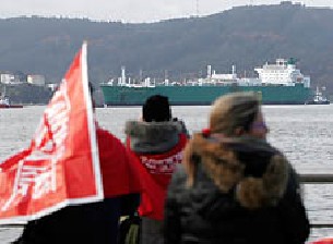 Cerca de un centenar de personas, convocadas por el Comité Ciudadano de Emergencia, se concentraron en el muelle de Curruxeiras, en Ferrol, para recibir con una cacerolada al buque Port Harcourt, el décimo metanero que llega a la planta de gas de Mugardos.