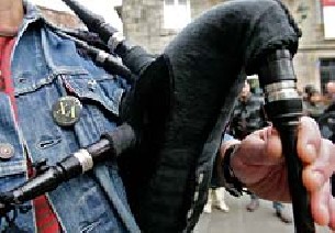 Más de cien personas se citaron este domingo en el Toural a modo de apoyo a los tres vecinos de O Eixo, que fueron encarcelados por agredir a un policía nacional. Del total, en torno a 50 personas eran gaiteiros, que se manifestaron a favor del indulto y que se dividieron en hasta cuatro grupos para recorrer las principales calles de la ciudad (tanto en el casco antiguo como en la zona nueva compostelana).