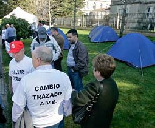 Los trabajadores de la mina de Serrabal (Boqueixón) y de las plantas de Ferroatlántica en las localidades coruñesas de Cee y Sabón han instalado sus tiendas de campaña en San Caetano para solicitar un cambio de trazado del AVE a su paso por la explotación. Para ello mantendrán el campamento durante toda la campaña.