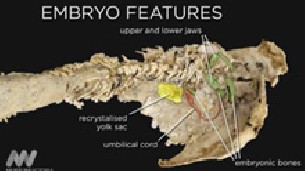 "El nuevo espécimen, notablemente preservado en tres dimensiones, contiene un único embrión intrauterino conectado a través de cordón umbilical mineralizado. Una masa amorfa situada cerca del cordón umbilical representa posiblemente un saco vitelino cristalizado", escriben los investigadores en la revista científica Nature.