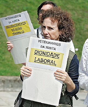 Unos doscientos veterinarios de la Xunta se manifestaron este miércoles en Santiago en demanda de mejoras laborales y bajo el lema ?Veterinarios Xunta, dignidade laboral?. La movilización se enmarca en los dos días de huelga que mantiene el colectivo para demandar al Gobierno gallego más estabilidad y más medios para desarrollar su trabajo.