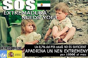 El número 1 de la coalición ICV-EUiA por la provincia de Tarragona en las elecciones generales, Lluís Suñé, insta a apadrinar a los niños de Extremadura por "1.000 euros al mes". Así lo manifiesta en un apunte en su blog, en el que figura un cartel, cuyo lema es: "Sos. Extremadura needs you". Además, aparecen dos niños, medio desnudos y con la cara y el pelo sucio, y en la parte inferior, dice: "Un 8,7% del PIB catalán no es suficiente. Apadrina un niño extremeño por 1.000 euros al mes".