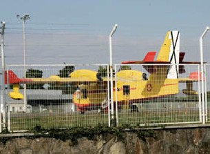 Un hidroavión del Ministerio de Medio Ambiente, Medio Rural y Marino, con base en el aeropuerto de la Lavacolla (Santiago de Compostela) durante la época de riesgo de incendios, rompió esta mañana entre 350 y 400 metros de cable de una línea de media tensión en el monte San Roque, en el municipio lucense de Portomarín, lo que provocó que varios núcleos de población de tres ayuntamientos sufriesen cortes en el suministro eléctrico.