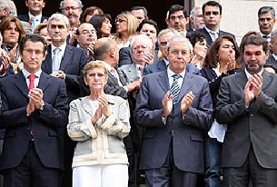 Con la lectura de esta declaración institucional, seguida de un minuto de silencio en recuerdo de las víctimas, se inició esta mañana el pleno del Parlamento. Al mediodía, fue interrumpida la sesión para escenificar esta misma protesta a las puertas del Pazo del Hórreo, donde se congregaron todos los parlamentarios y miembros de la Cámara gallega para un nuevo minuto de homenaje sin palabras.