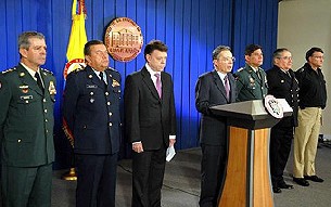 Uribe compareció ante la prensa junto al ministro de Defensa, Juan Manuel Santos, y el comandante de las Fuerzas Militares, el general Freddy Padilla de León, para anunciar "unas drásticas decisiones" administrativas sobre los implicados.
