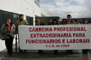 Unos 120 trabajadores de centros sanitarios de la provincia de Pontevedra se manifestaron ante la sede de la Consellería de Sanidade en San Lázaro para reclamar el acceso "polo réxime extraordinario" a la carrera profesional de la administración de salud.
