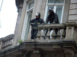 Los hechos ocurrieron a mediodía de este miércoles cuando la mujer llevaba al niño en un carrito, y al pasar junto a la entrada de la sucursal bancaria situada en la confluencia de las calles Príncipe y Velázquez Moreno, cayó un trozo de balaustrada desde el primer piso, cayendo parte de la mampostería sobre el carro del niño.