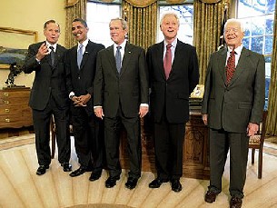 Los participantes, los ex mandatarios Jimmy Carter, George Bush y Bill Clinton, el presidente actual George W. Bush y Obama, comparecieron ante los medios brevemente en el Despacho Oval antes del almuerzo, en un evento en el que el gobernante saliente dijo a Obama que todos ellos le desean que tenga éxito durante su gestión.