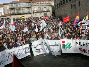 Más de 5.000 gallegos y residentes en Galicia, según alguna de las organizaciones que convocó la movilización, se manifestaron en las calles de Santiago de Compostela contra "o masacre de Gaza". La manifestación, encabezada por una pancarta con el lema "Galiza con Pelestina. Non ao masacre", partió pasada la media mañana del Paseo Central de la Alameda. Y finalizó en la plaza de A Quintana. Podían verse cientos de banderas palestinas y de Galicia. El vicepresidente de la Xunta, Anxo Quintana, reclamó, en persona, "unha resposta clara e contundente para o respeto dos dereitos do pobo palestino".