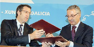 Un "pacto histórico", que desde Xunta y Gobierno central han dado en llamar "Acordo do Obradoiro", permitirá que el AVE conecte a Galicia con la Meseta en el año 2015 mediante una inversión de 4.700 millones de euros, lo que supondrá la "revolución industrial" gallega, que llega con retraso a la comunidad, pero que permitirá que las empresas ganen "competitividad". Lo admitió el ministro de Fomento, José Blanco, que firmó el convenio con el presidente de la Xunta, Alberto Núñez Feijóo, en un acto celebrado en el Hostal dos Reis Católicos, al que acudieron dirigentes socialistas y populares, y ningún nacionalista.