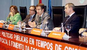 Con el fin de sacar a Galicia de la crisis económica, el presidente solicitó la colaboración de los empleados públicos a los que ve "preparados para afrontar estes retos", destacando que toda la estructura territorial de Galicia pivota sobre los funcionarios, al margen de los cinco delegados provinciales. Así las cosas, llamó a los 90.000 empleados públicos -de los que 35.000 son sanitarios y "máis 30.000" son docentes- a desempeñar su labor "con eficiencia" y a convertirse en "necesarios" para que los servicios públicos funcionen con los "menores custes posibles".