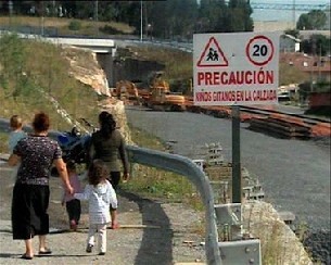 Varios vecinos de As Rañas instalaron una señal en la zona, con el lema "Precaución, niños gitanos en la calzada", para advertir de la presencia de menores en una zona por la que transitan los camiones que trabajan en las obras del AVE e instarles a reducir la velocidad en el tramo.