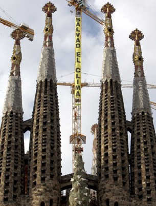 La organización ecologista Greenpeace se ha encaramado a una de las grandes grúas de la Sagrada Familia para desplegar una pancarta de 600 metros cuadrados, coincidiendo con el encuentro sobre el cambio climático que se abre hoy en Barcelona, en la que piden a los líderes políticos que tomen la decisión de salvar el clima.