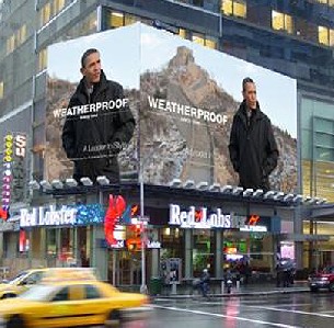 La empresa Weatherproof se ha servido de una fotografía en la que el presidente aparecía con un abrigo que la propia marca ya ha denominado 'chaqueta Obama'. La imagen fue tomada durante la visita del mandatario a la Gran Muralla china y aparece tanto en la conocida plaza neoyorquina como en la página web de la empresa. De hecho, la compañía trató de publicar el anuncio en varios periódicos norteamericanos, pero éstos se negaron a difundirla.