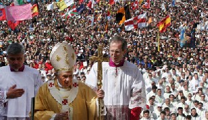 Ante medio millón de personas, según fuentes de la policía, miles de ellas españolas, que abarrotaron la explanada del santuario de Fátima, Benedicto XVI ofició hoy la misa solemne en el día en que la Iglesia conmemora la primera de las seis apariciones de la Virgen en 1917 a los tres niños pastores videntes Lucía, Jacinta y Francisco.