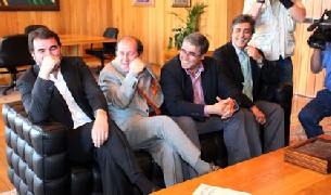 La presidenta del Parlamento de Galicia, Pilar Rojo, recibió a la presidenta de la Cámara vasca, Arantza Quiroga Cia, con motivo del primer aniversario de ambas en el cargo. En la recepción, que se desarrolló en el despacho presidencial, también participaron los miembros de la Mesa y los portavoces parlamentarios. La "austeridad" que impera en la cámara obligó a los representantes de los tres grupos a compartir sofá con el miembro de la Mesa, Anxo Quintana.