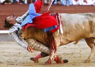La cornada se produjo al perder el torero pie durante la faena de muleta al primer toro de la tarde. El toro fue a por él cuando estaba en el suelo y le metió el pitón a la altura del cuello y lo sacó por la boca.