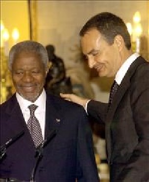 Por su parte, Zapatero dijo que expuso hoy a Annan la posición española ante el programa nuclear iraní, que dijo que es la que defiende la Unión Europea y que pasa por ser "firmes partidarios de que no haya ningún desarrollo de armas nucleares y de que el diálogo político sea el camino para el entendimiento con Teherán".Respecto a la reunión que mantuvo en Madrid con Lariyani, Zapatero dijo que le transmitió que Europa, y en particular el Gobierno español, quieren un acuerdo diplomático con Irán y que este país respete el orden legal.