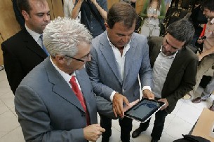 El conselleiro de Economía e Industria, Javier Guerra, y el director xeral de Investigación, Desenvolvemento e Innovación, Ricardo Capilla Pueyo, presentaron la aplicación 'O Camiño en GPS', la primera guía interactiva para peregrinos que permite recrear las rutas del Camino de Santiago desde los dispositivos Ipad y Iphone.