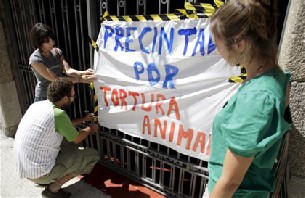 localidad con una cinta con el lema "Precintado por tortura animal". Un