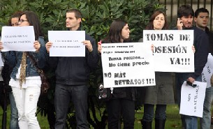 Más de 50 opositores se manifestaron frente a la sede central de la Xunta de Galicia en San Caetano, en Santiago, para exigir su inmediata incorporación trás más de dos años de espera. Los afectados por los retrasos denunciados, correspondientes a oposiciones convocadas en 2008, se elevan a unos 450, según las estimaciones del sindicato CC.OO.