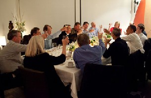Todos los comensales aparecen en la instantánea publicada por el gabinete de Obama brindando con sus copas. Quizá la presencia de Jobs ha sido la que más expectación ha causado debido a su delicado estado de salud. No se le ve la cara pero se aprecia que está más delgado tras el anuncio de su baja médica.