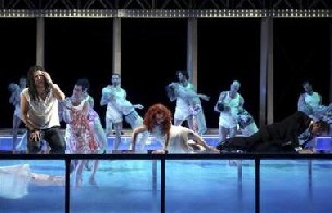 El director de escena ha querido subrayar del libreto, basado en "Las Bacantes" de Eurípides, la lucha entre lo dionisíaco y lo apolíneo, entre el placer y la razón, pero también al descubrimiento del "sur" y de la homosexualidad del compositor y del libretista.