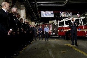 En su visita a esta unidad de bomberos Obama, que tuvo ocasión de ver una placa de bronce que en uno de los muros rinde homenaje a los quince caídos, estuvo acompañado por el ex alcalde de Nueva York Rudy Giuliani y el comisionado de Bomberos Salvatore Cassano, entre otros.
