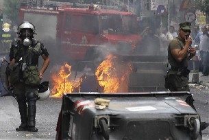 En otro punto del centro histórico de la capital griega los bomberos tuvieron que intervenir para liberar a siete personas atrapadas en la segunda planta del Eurobank, incendiada por los cócteles molotov lanzados por un grupo radicales. Además, fueron destruidos los escaparates de dos bancos en la plaza Sintagma, numerosas tiendas y paradas de autobús, e incendiados varios contenedores de basura.