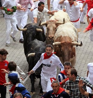 Los toros de la ganadería gaditana de Torrestrella han inaugurado hoy los encierros de los Sanfermines del 2011 con una carrera limpia y rápida, en la que los cabestros han protagonizado las principales anécdotas.