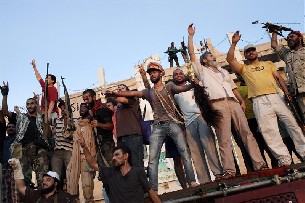 Al parecer, el complejo presidencial fue destruido por un bombardeo de la OTAN antes de ser tomado por los seguidores del Consejo Nacional de Transición (CNT), que ya han hecho ondear en sus ruinas la antigua bandera tricolor del país.