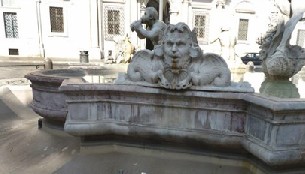 El tritón dañado, así como el resto de máscaras ornamentales que componen la fuente del Moro, son copias. Los originales se encuentran repartidas por la Villa Borghese, uno de los parques más grandes y nobles de la capital italiana.