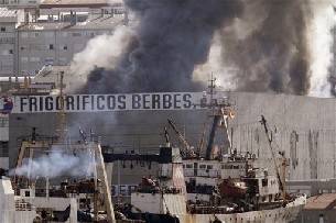 Fuentes de Frigoríficos del Berbés explicaron que en la nave había escaso pescado almacenado porque la mayoría de la producción se ha trasladado a otra planta en el polígono industrial de Salvaterra.