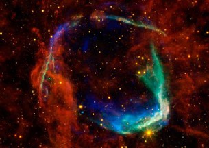 Las imágenes de rayos X del observatorio XMM-Newton de la Agencia Espacial Europea y del Observatorio de rayos-X de la NASA Chandra se combinan para formar los colores azul y verde en la imagen, que muestran que el gas interestelar se ha calentado a millones de grados por la onda expansiva de la supernova.
