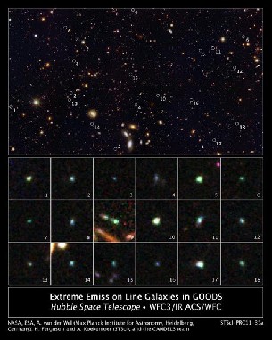 Los astrónomos que utilizan los instrumentos del Hubble pudieron detectar las galaxias debido a que la radiación de estrellas jóvenes ha causado que el oxígeno en el gas que las rodea ilumine "como un letrero de neón".