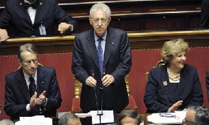 El primer ministro italiano, Mario Monti, obtuvo el "sí" definitivo por parte del Parlamento a su recién constituido Ejecutivo y anunció que, a partir de ahora, Italia contribuirá "permanentemente" al eje París-Berlín para abordar los problemas de la eurozona.