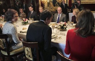Durante el almuerzo, don Juan Carlos ha estado flanqueado por Sonsoles Espinosa -a cuya derecha se sentaba el príncipe- y la vicepresidenta económica del Gobierno, Elena Salgado, y doña Sofía por Rodríguez Zapatero -sentado a la izquierda de doña Letizia- y el vicepresidente de Política Territorial, Manuel Chaves.
