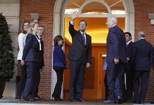 Flanqueado por la vicepresidenta y ministra de la Presidencia y portavoz, Soraya Sáenz de Santamaría, a su derecha, y el ministro de Asuntos Exteriores y Cooperación, José Manuel García Margallo, a su izquierda, Rajoy ha posado sonriente junto al resto de su Gabinete en las escaleras del Palacio de la Moncloa y antes de presidir el primer Consejo de Ministros del Gobierno del PP.