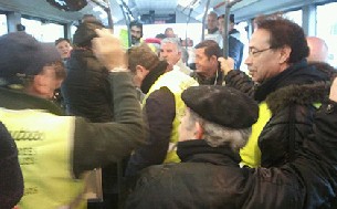 Protestan por lo que consideran tarifas "abusivas" del transporte público y por los recortes en los servicios metropolitanos de Barcelona. Aunque han pagado su billete, se niegan a bajarse del autobús y "amenizan" a los pasajeros con consignas y pitos.