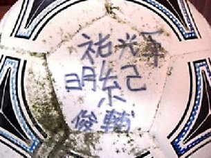 Sobre la pelota está escrito el mensaje "¡Ánimo Misaki Murakami!", fechado en marzo de 2005 y firmado por alumnos de tercer curso de la escuela primaria a la que asistía el joven.