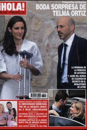 Las revistas del corazón inundan sus portadas con la triste noticia del fallecimiento de Juan María, padre de Iñaki Urdangarin, y de su último adiós en Vitoria. Sin embargo, una buena noticia ocupa parte de todas las portadas: la boda sorpresa de Telma Ortiz, hermana de la Princesa Letizia, de la que la revista ¡Hola! tiene unas imágenes exclusivas.