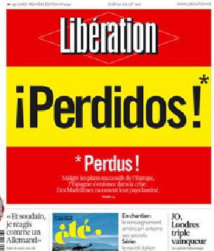 Una enorme bandera española y, entre exclamaciones, un elocuente "¡Perdidos!". Así ve la situación el diario conservador francés Libération justo el día después de la visita del ministro de Economía, Luis De Guindos, para reunirse con su homólogo galo, Pierre Moscovici.