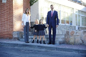 Las pequeñas vestidas con el uniforme escolar, se mostraron muy sonrientes y relajadas ante las cámaras. Cogidas de la mano, Leonor y Sofía, caminaron junto a sus padres, Letizia agarrándo la mano de la pequeña y Don Felipe la de la mayor.